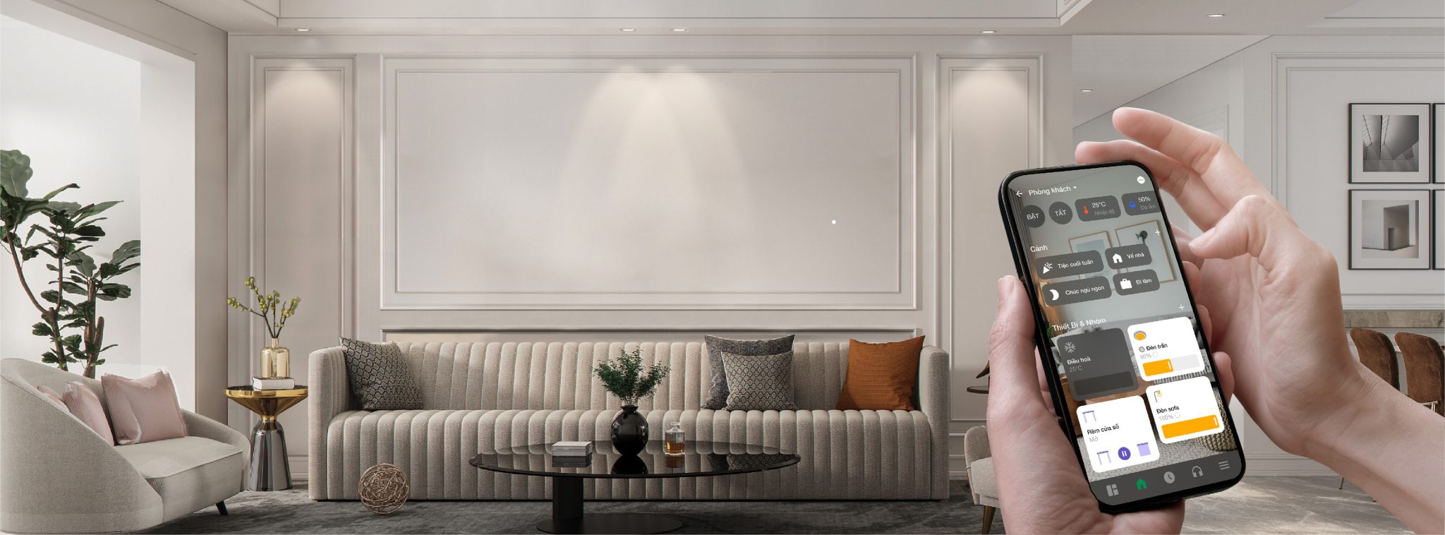 – “Tiếp khách” – Bật toàn bộ hệ thống đèn phòng khách như đèn chùm, downlight, đèn tranh…